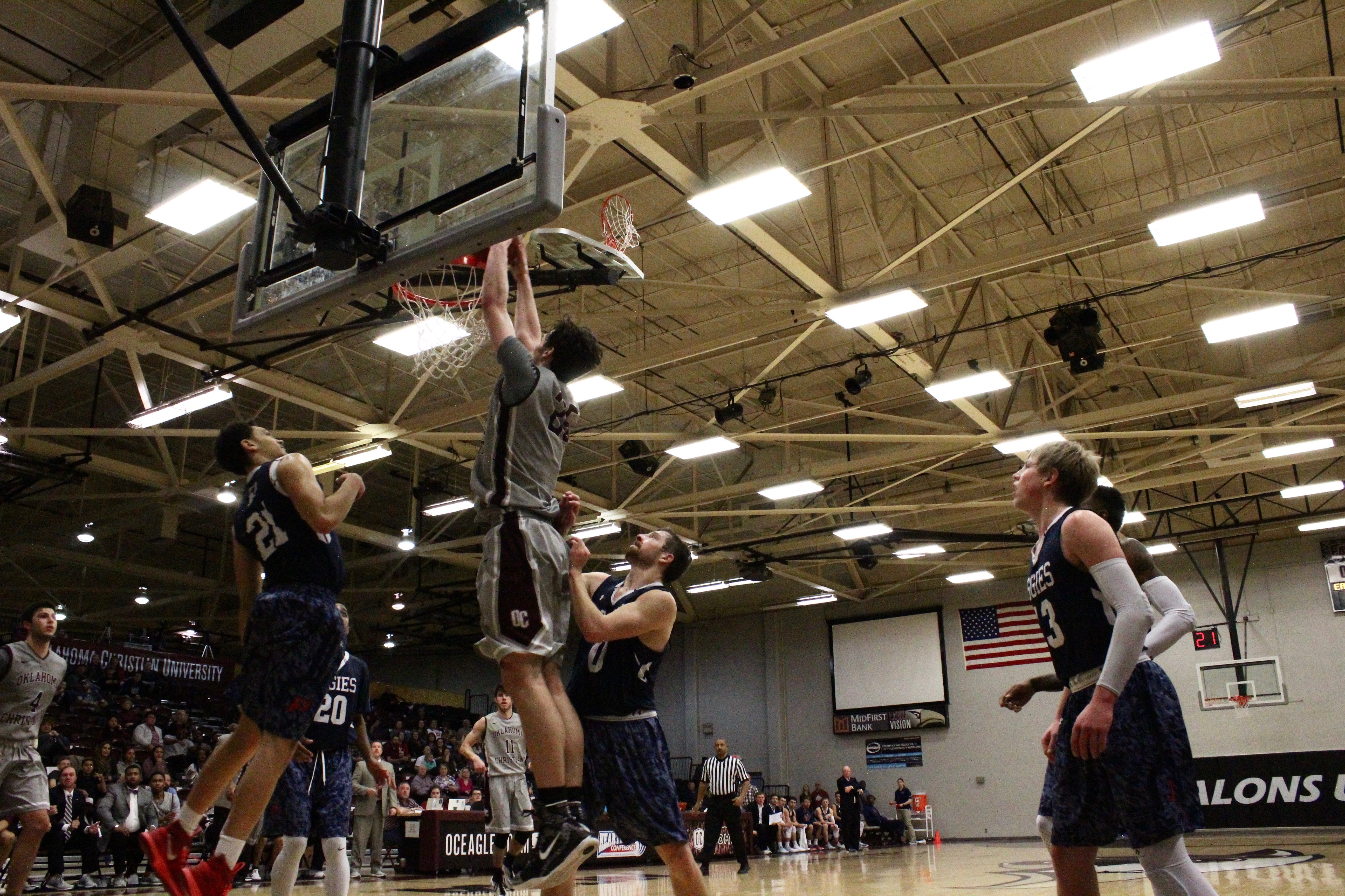 Junior Marcus Mathieu connected one free throw with 15 seconds remaining to solidify the two-point victory over the Jets. Mathieu led the Eagles in scoring with 25 points. Senior John Moon completed his sixth double-double of the season with 17 points and 12 rebounds, which moved him into 10th place on Oklahoma Christian’s career scoring list with 1,701 points.
